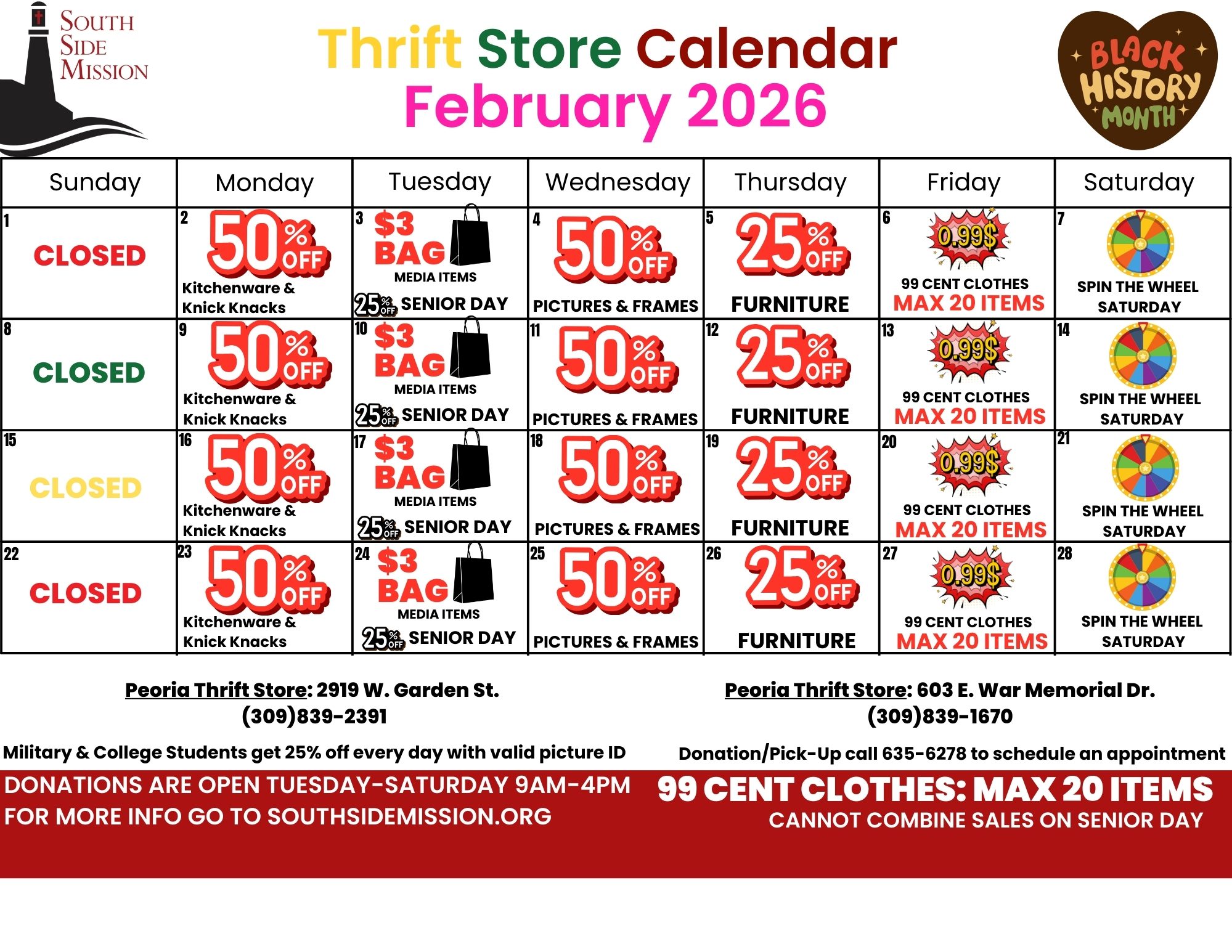 South Side Mission does not currently have a benevolence fund for furniture, appliances, or clothing. However, our thrift stores in Peoria are affordably priced. In addition, please check our sales calendar for senior citizen days, clothing, and other sale dates.